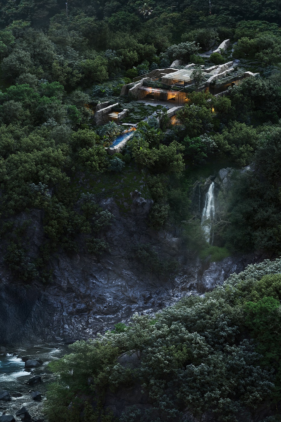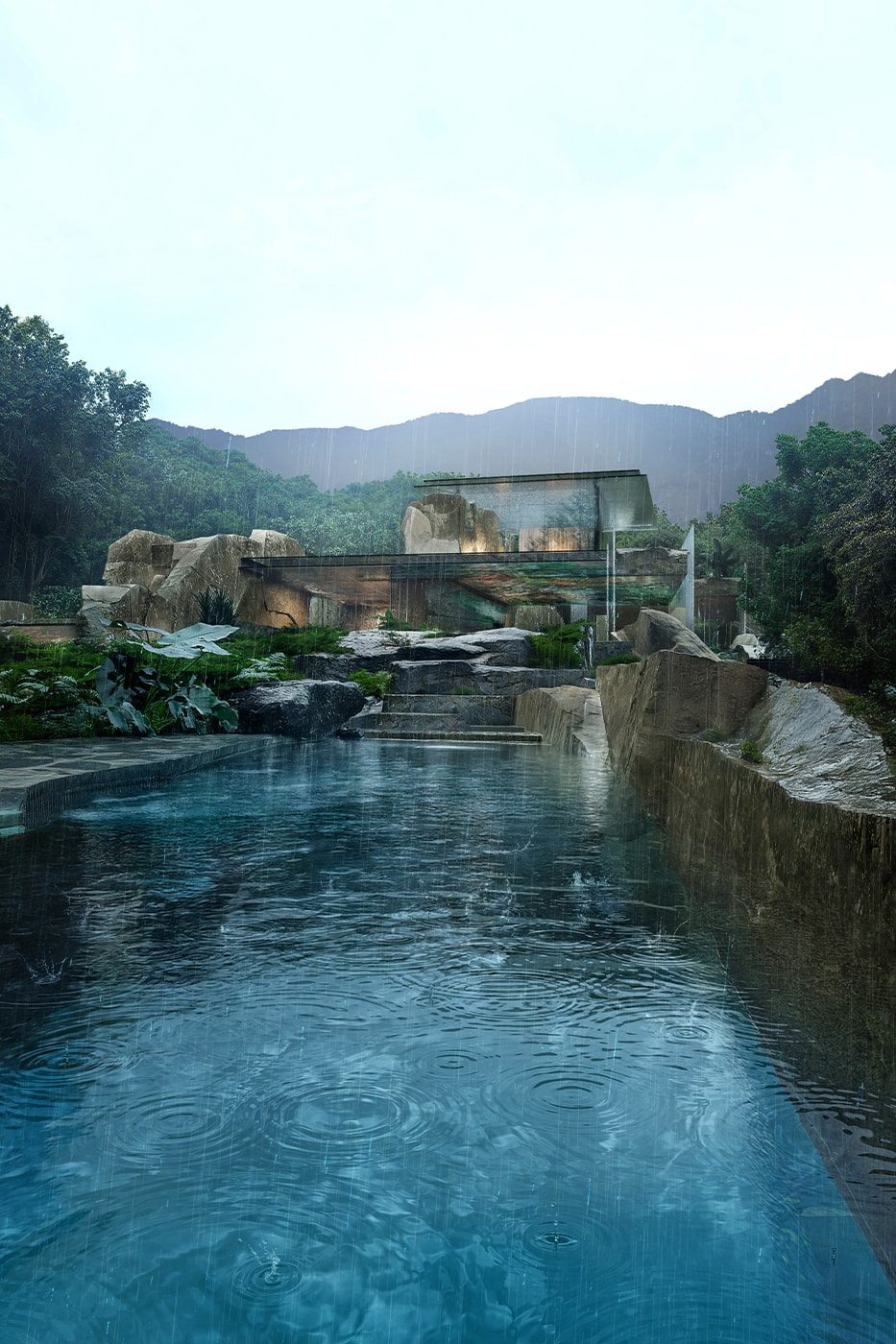 Визуализация проекта демонстрирует здание, интегрированное в естественные контуры ландшафта. Скалы и каменные блоки отеля расположены так, как будто они все еще были частью острова. Стены местного каменного и панорамного остекления образуют низкоуазвированную структуру, которая открывает лес. Проект способствует медленному погружению в окружающую среду и подчеркивает тонкий баланс между построенным объемом и ландшафтом.