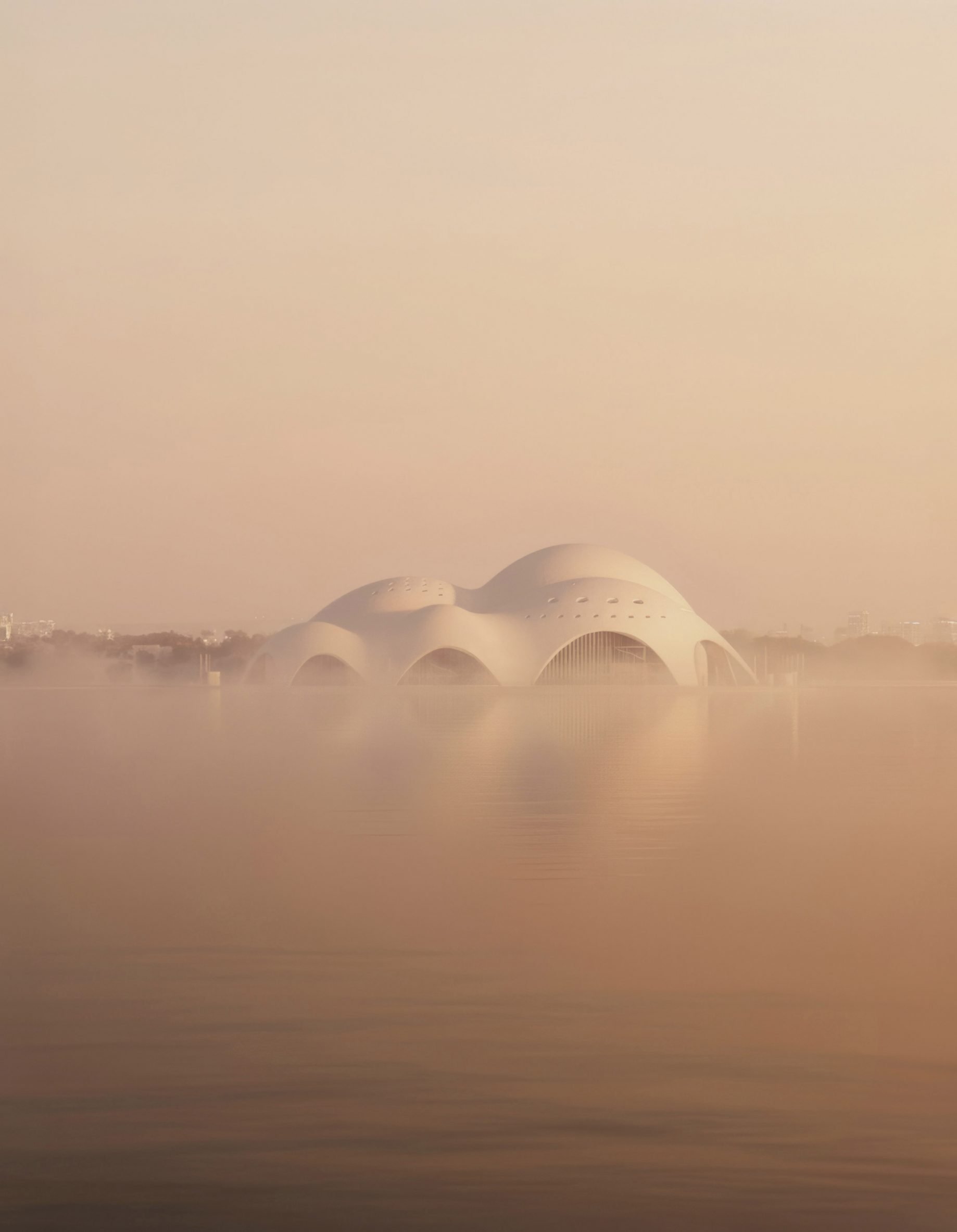Изогнутый силуэт здания навеян изображением жемчуга. Крыша представляет собой тонкую бетонную оболочку, образующую группу куполов, увенчанных слуховыми окнами и высокими арочными проемами, сквозь которые видны стеклянные фасады. Нагрузка распределяется по множеству опор и внутренним точкам по периметру самого острова, который по сути и составляет контур здания. Чтобы усилить сходство конструкции с жемчужиной, в отделке планируют использовать перламутровую керамическую плитку, которая будет сверкать на солнце и отражать гладь озерной воды.