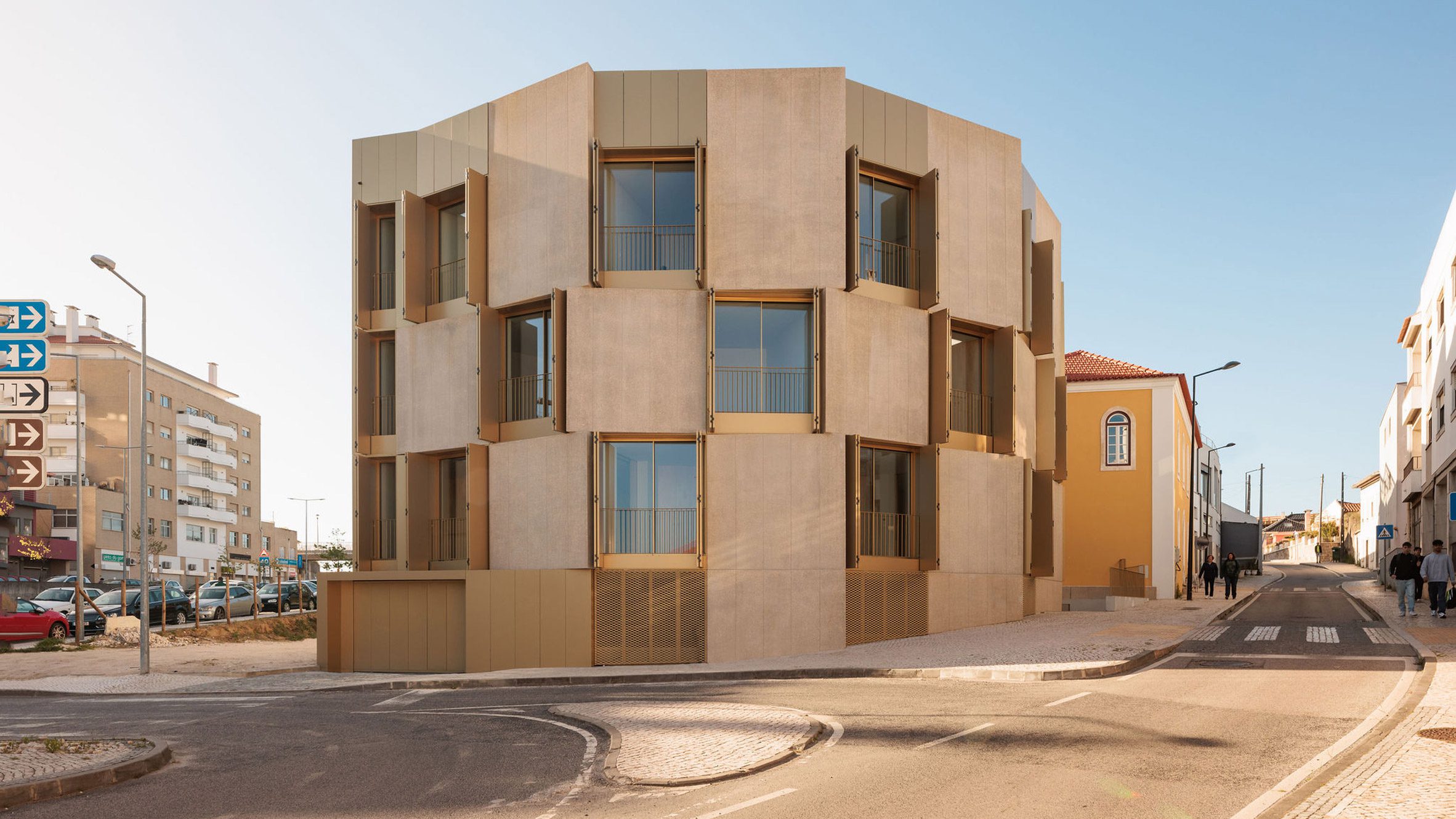 Архитектурная студия Bureau des Mésarchitecture завершила строительство жилого дома в португальском городе Лейрия. Облицованное бетоном и позолоченными алюминиевыми ставнями здание расположено на пересечении старого и нового районов. В доме было размещено пять квартир, и он был соединен с желтым зданием 20 века, которое в рамках проекта было отремонтировано и преобразовано в две дополнительные квартиры.